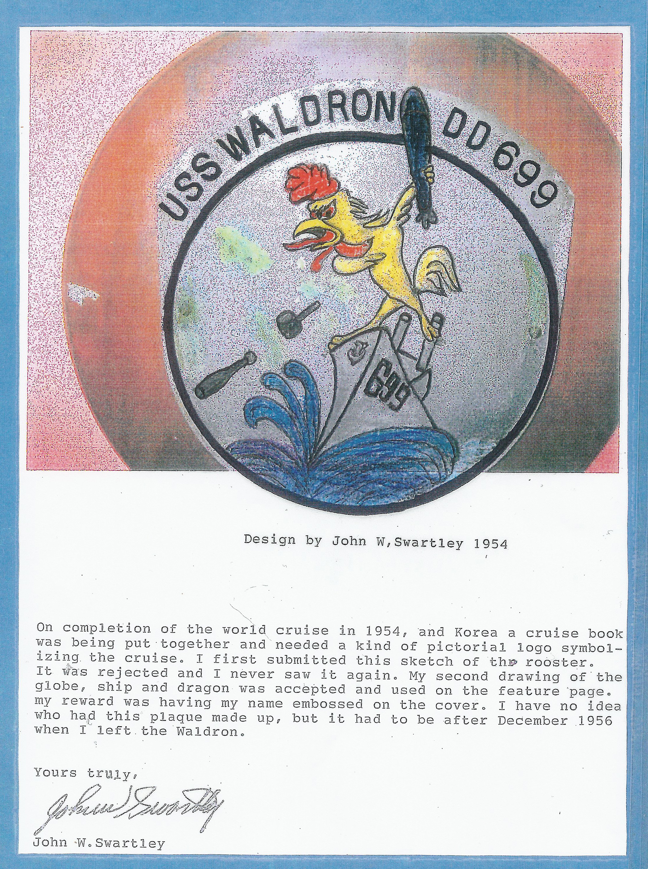 Original Art by John Swartley - World Cruise Logo 1954 , Feature Page of 1954 World Cruise Book , Waldron Alumni Association , Plank Owner , Waldron Association Patch , Certificate of Appreciation